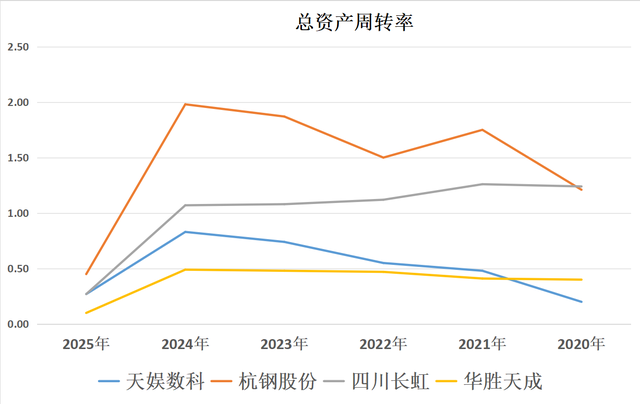 可以看到,天娱数科、杭钢股份、华胜天成的资产周转速度在过去五年均有上升,而四川长虹下降。